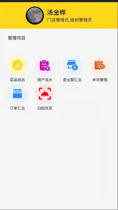 管理功能:门店管理,菜品排名,时时营收,平均客单价,大数据分析